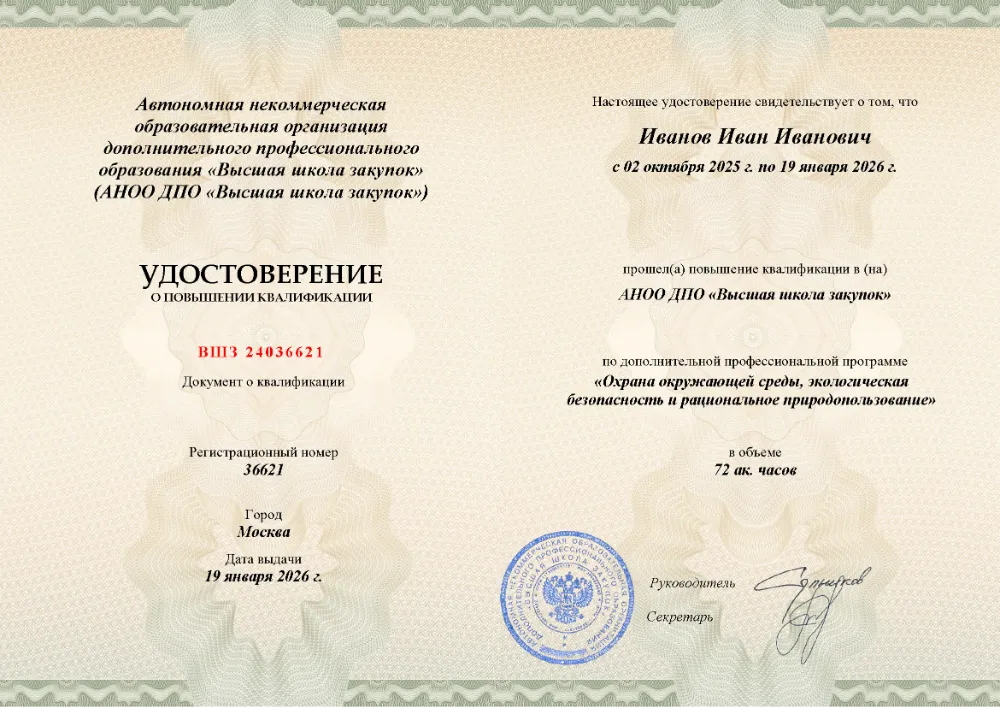 Повышение квалификации, 72 академических часа, 9 модулей: правовые основы и государственное управление в области экологии, производственный экологический контроль, документирование деятельности, система экологического менеджмента (ISO 14001) и ответственность за нарушения. Онлайн-обучение в во Владимире с итоговой аттестацией.