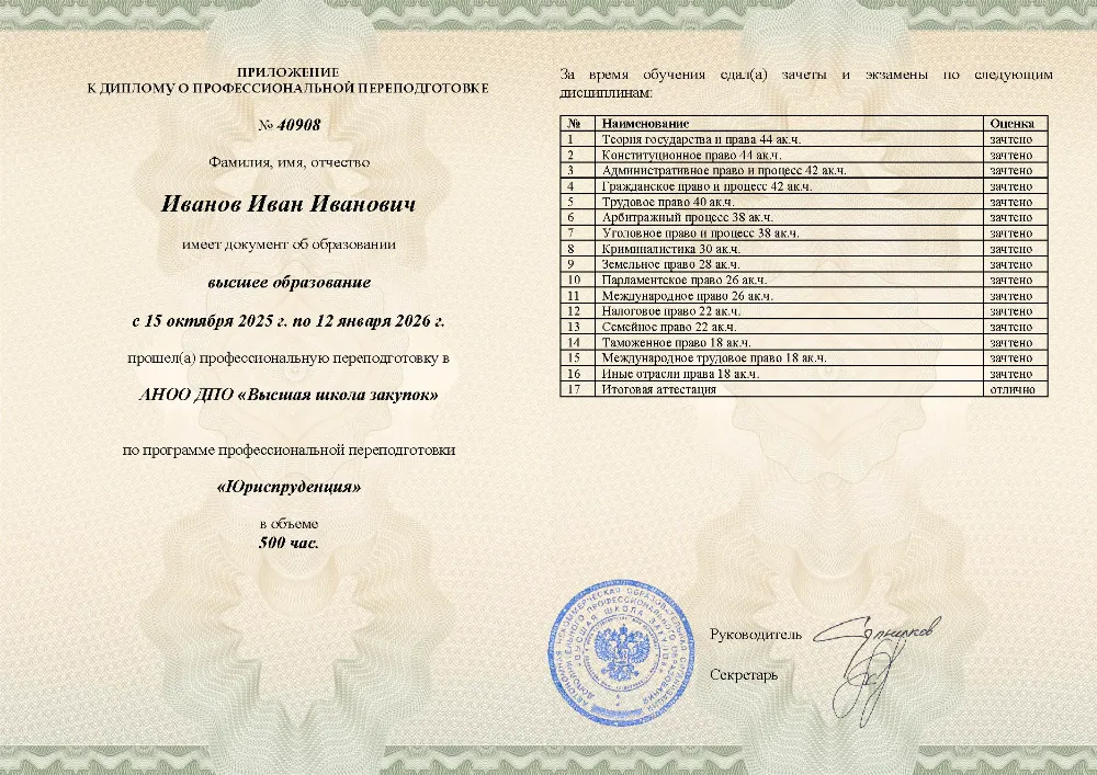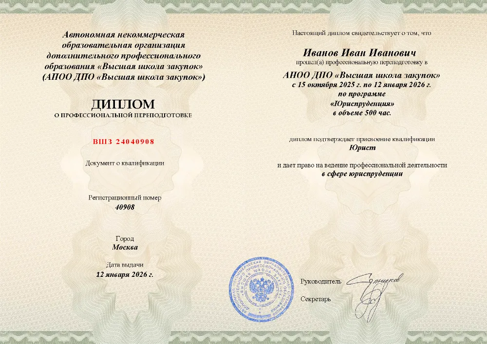 Профессиональная переподготовка, 500 академических часов, 16 модулей: теория государства и права, конституционное, гражданское, уголовное и трудовое право, арбитражный и административный процесс, налоговое, земельное, таможенное и международное право. Онлайн-обучение в во Владимире с итоговой аттестацией.