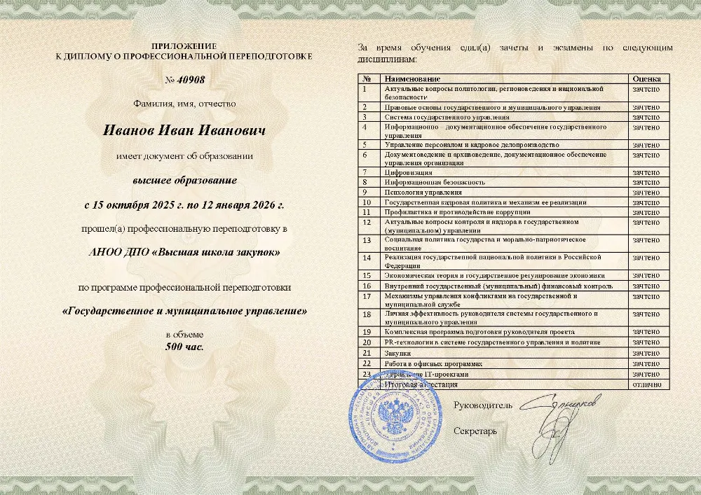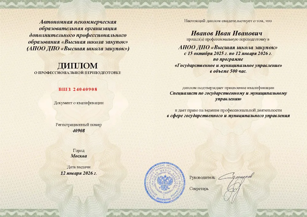 Профессиональная переподготовка, 500 академических часов, 25 модулей: правовые основы и система государственного управления, управление персоналом, финансами и противодействие коррупции, социальная политика и экономическое регулирование, цифровизация, закупки и информационная безопасность. Онлайн-обучение в во Владимире с итоговой аттестацией.