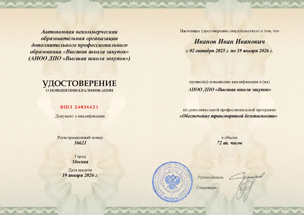 Повышение квалификации, 72 академических часа, 10 модулей: нормативная правовая база и система мер обеспечения транспортной безопасности, планирование и реализация защитных мероприятий, информационное обеспечение и государственный контроль, оценка состояния защищенности объектов. Онлайн-обучение в во Владимире с итоговой аттестацией.